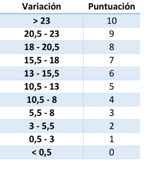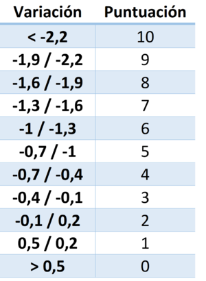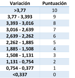 En este caso hemos dado una puntuación de 0 a todos los barrios en los que la edad media ha aumentado por encima de la media y a aquellos en los que ha aumentado por debajo de la media de la ciudad o incluso ha disminuido la edad media les hemos dado valores según la siguiente tabla, correspondiendo las puntuaciones mayores a los barrios que han sufrido un rejuvenecimiento.