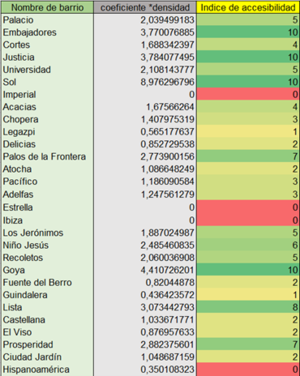 Mediante una tabla dinámica en Excel obtenemos el número de estaciones existentes en cada barrio y se calcula el cociente entre el número de estaciones por barrio y el área del barrio en kilómetros cuadrados, obteniendo la densidad de estaciones por barrio. Para realizar una mejor aproximación de la accesibilidad será necesario aplicar una corrección a la densidad calculada anteriormente en función de la lejanía de la estación respecto del centro de Madrid (estación de Sol). Para obtener el factor de corrección hacemos buffers cada 1260 metros con centro en la estación de Sol y se le asigna a cada estación un coeficiente de 0 a 1 en función del buffer en el que se encuentre la estación en cuestión. De esta forma el coeficiente será 1 en las estaciones cercanas al centro de Madrid y 0.1 en las estaciones más alejadas. A continuación, se calcula mediante una tabla dinámica el promedio de los coeficientes asignados a las estaciones pertenecientes a un mismo barrio, obteniendo el factor de corrección. Finalmente, este factor se multiplica por la densidad de estaciones calculada anteriormente. Hemos decidido incluir este factor de corrección puesto que, evidentemente, cuanto mayor sea la distancia geometría de las estaciones al kilómetro cero, menor será la accesibilidad que aportan, puesto que es en el centro de la ciudad donde más líneas de metro tienen parada.