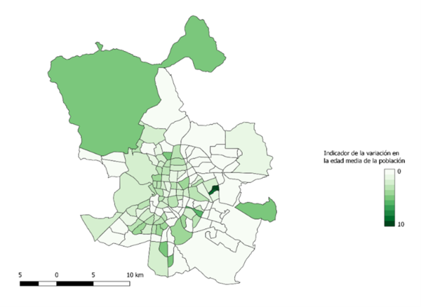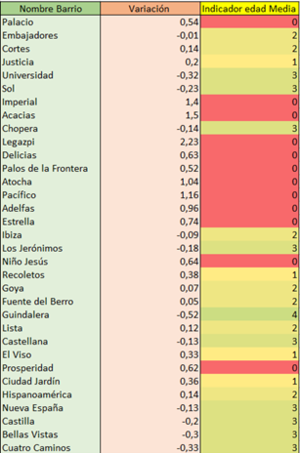 Con este indicador pretendemos estudiar cómo ha evolucionado la edad de la población en cada barrio. Generalmente el fenómeno gentrificador es ejercido por población joven adulta que busca lugares más atractivos para su residencia, además, las personas más susceptibles de ser desplazadas son los ancianos que sufren antes que el desplazamiento físico un desplazamiento emocional al ver como su barrio cambia totalmente y deja de ser, en definitiva, su barrio. Por este motivo se considera un signo de la gentrificación una disminución de la edad media de la población o un aumento por debajo de la media, considerando que en general en todo el país existe un envejecimiento poblacional. Para realizar este indicador, hemos obtenido los datos de las edades medias de la población por barrios de 2022 y 2016 del “Panel de indicadores de distritos y barrios de Madrid. Estudio sociodemográfico” obtenido en el Portal de datos abiertos del Ayuntamiento de Madrid. Posteriormente, en Excel hemos calculado la variación de la edad media realizando la diferencia entre el valor de la edad media en 2022 y el valor de 2016.