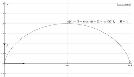 text(pi()*R,2.1*R,['$ \gamma (t) = (t-sin(t))\vec{i}+(1-cos(t))\vec{j},\hspace{0.5cm}R=1 $'],'interpreter','latex',"FontSize",17);