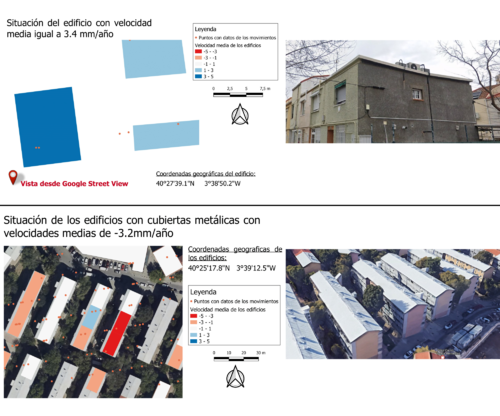 Se aprecia cómo las velocidades son bastante moderadas, los extremos son pocos y muy localizados. Por tanto, no parece que exista ninguna zona que pueda suponer una preocupación importante a la hora de desarrollar la traza del túnel. Extremos tan localizados invitan a pensar en patologías de estructuras concretas o a falsas mediciones de desplazamientos, que podrían ser generadas por ejemplo por cubiertas metálicas, muy susceptibles a las variaciones térmicas. En dichos casos se ha acudido a consultar Google Street View y la función 3D de Google Maps, obteniéndose así las Figuras 4 y 5. | Se aprecia cómo las velocidades son bastante moderadas, los extremos son pocos y muy localizados. Por tanto, no parece que exista ninguna zona que pueda suponer una preocupación importante a la hora de desarrollar la traza del túnel. Extremos tan localizados invitan a pensar en patologías de estructuras concretas o a falsas mediciones de desplazamientos, que podrían ser generadas por ejemplo por cubiertas metálicas, muy susceptibles a las variaciones térmicas. En dichos casos se ha acudido a consultar Google Street View y la función 3D de Google Maps, obteniéndose así las Figuras 4 y 5. | ||