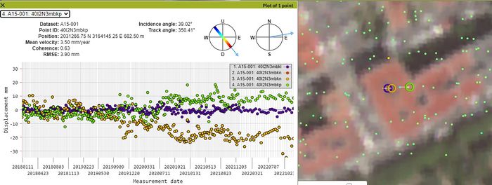 Una vez hecho esto, se ha procedido al estudio de la velocidad media de desplazamiento vertical (en mm/año) y de su desviación típica. Estos datos fueron proporcionados por Detektia, componiendo el movimiento vertical a partir de las series de datos A15 y D16 del EGMS. Los puntos que componen dichas series se agruparon según el edificio al que correspondían, obteniendo así valores medios por edificio.