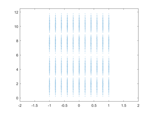 Dibujo del mallado que representa el interior del sólido. Tomamos los ejes en el rectángulo [math](x, y) ∈ [−1; 1] × [0; 12] [/math]y como paso de muestreo h = 2/10 para las variables x e y.