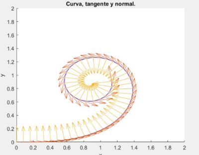 Por otro lado los vectores normales son los vectores que forman un ángulo de 𝞹/2 con los vectores tangentes y se definen como: [math] n(t)= (-y'(t)i+x'(t)j)/√x'(t)2+y'(t)2. [/math]