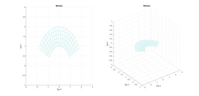 Empezaremos delimitando la sección sobre la que se va a trabajar, una placa plana que está definida por dos anillos de radios 1 y 2 que se corta sobre un plano [math]y≥|x|/2 [/math], esto se podrá observar en la Figura 1. En este caso se usaran coordenadas cilíndricas, donde nuestras variables serán: [math]\rho[/math] y [math]\theta [/math] que se encontraran entre los valores: [math]1 \leq \rho \leq 2[/math] y [math]0,464 \leq \theta \leq 2,678[/math]. La sección del anillo se puede observar con una z genérica, la placa plana se puede en dos dimensiones, en los ejes X e Y que tienen esta delimitada en los intervalos [-3,3]x[-1,3] y en tres dimensiones donde el eje Z no esta delimitada.