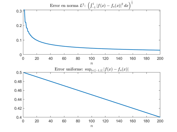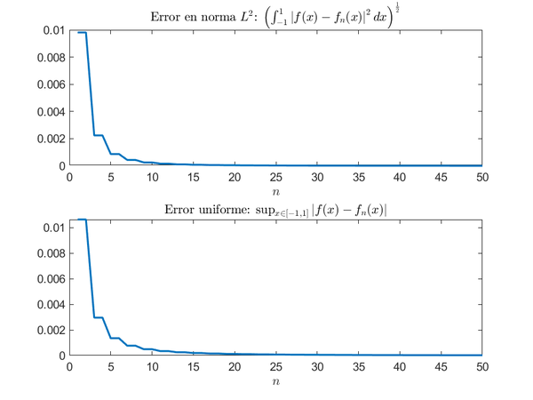 En las gráficas anteriores no se aprecia como mejora la aproximación según aumenta el valor de [math]n[/math], sin embargo, esto se aprecia muy bien en las que se muestran a continuación. En la primera, se observa cómo disminuye rápidamente el error en la norma de [math]L^2(-1,1)[/math] según aumentamos el valor de [math]n[/math]. La segunda gráfica representa la misma idea pero empleando la norma uniforme.