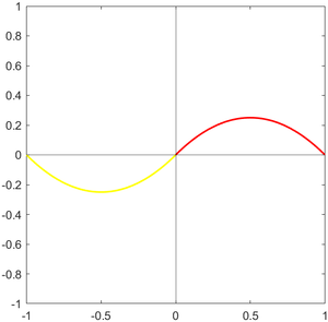 Apliquemos lo anterior a la función [math]f(x)=x\cdot (1-x)[/math] en el compacto [math][0,1][/math], cuya gráfica y su correspondiente extensión impar se muestran a continuación.