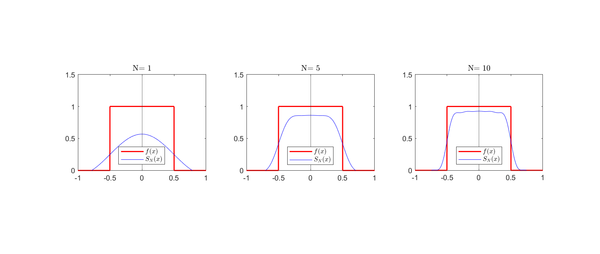 Es fácil ver que esta función es continua en todo su dominio salvo en [math]x=\frac{1}{2}[/math] y [math]x=-\frac{1}{2}[/math], por lo que la serie convergerá puntualmente en todo el compacto salvo en esos puntos; en los que valdrá [math]\frac{1}{2}[/math]. Esto se aprecia muy bien en la siguiente figura, en la que se muestra la serie de Fourier con [math]n=1,5,10[/math].