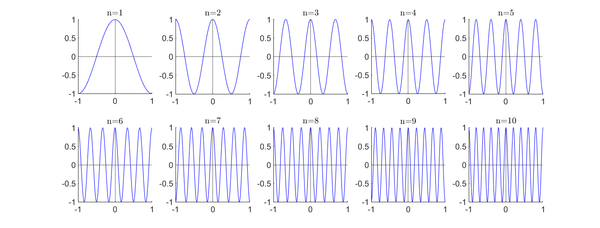 A continuación se muestra una gráfica de los diez primeros elementos de la base de la forma [math]\cos(n\pi x)[/math].
