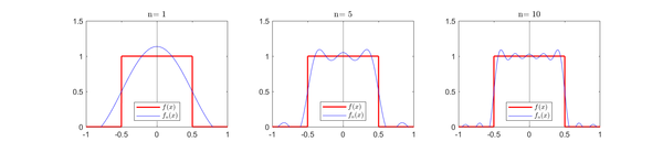 Para ver cómo converge la serie de Fourier se han calculado los [math]n[/math] primeros términos para [math]n=1,5,10 [/math] y se han dibujado en la misma gráfica junto a la función a aproximar. A lo largo del artículo se denotará como [math]f_n[/math] a la suma de los [math]n[/math] primeros términos de la serie de Fourier.