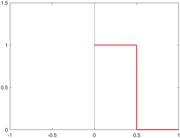 Apliquemos lo anterior a la función [math]f(x)=1_{x \leq \frac{1}{2}}(x)[/math] definida en el compacto [math][0,1][/math], cuya gráfica y su correspondiente extensión par se muestran a continuación.