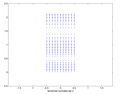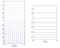 Sobre la superficie de trabajo se ha aplicado una fuerza que ha provocado una vibración que produce sobre ella un desplazamiento en un instante [math]t_0[/math] que queda definido por el vector:[math]\vec u(x,y)=\frac{\sin(\pi y)}{10}\vec j[/math] Si aplicamos este vector a cada punto tendremos el desplazamiento total respecto a la posición de la placa en reposo. La representación de este campo se ha hecho mediante el siguiente código MATLAB: