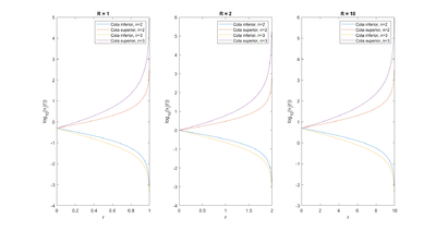 Si representamos funciones cota [math]v_1[/math] y [math]v_2[/math] en escala logarítmica en función de [math]r\in [0,R][/math] para varios valores de [math]R[/math] (en este caso [math]R=1,2,10[/math]) se tienen las siguientes gráficas: