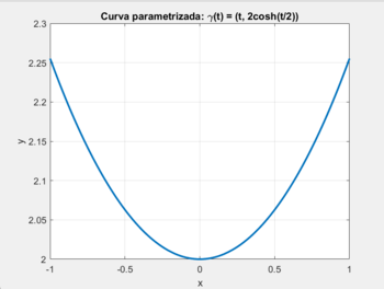 La gráfica muestra la curva parametrizada por: [math] ''' γ(t)=(t,2cosh(t/2))[/math], que corresponde a la catenaria de parámetro A=2, con [math]t\in(-1,1) [/math]