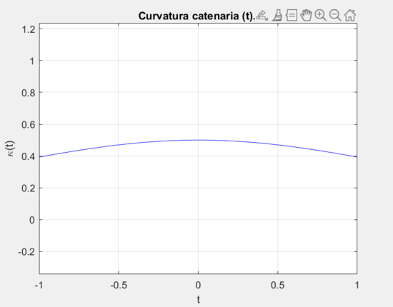 | − | La gráfica muestra la curva parametrizada por: <γ(t)=(t,2cosh(t/2))>, que corresponde a la catenaria de parámetro A=2, con <t\in(-1,1)> | + | La gráfica muestra la curva parametrizada por: <math> ''' γ(t)=(t,2cosh(t/2))</math>''', que corresponde a la catenaria de parámetro A=2, con ''' <math>t\in(-1,1) </math>''' |