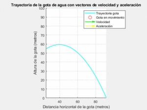 | − | title('Trayectoria de la gota de agua | + | title('Trayectoria de la gota de agua con vectores de velocidad y aceleración'); |