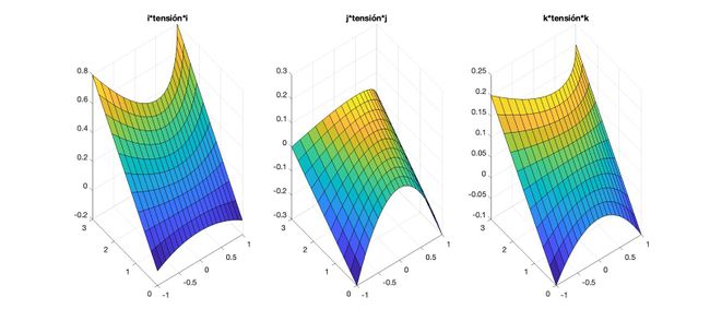 Calculamos la tension de deformación, para ello, hayamos la derivada parcial de componente tal y como se representa en los siguientes cálculos. La formula de la Tension esta compuesta por la divergencia, esa el la razón por la cual obtendremos una matriz multiplicada por un numero.
