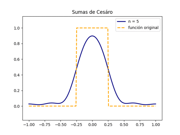 [[Archivo:Sumas_cesaro_MECA.gif|600px|thumb|right| Sumas de Cesàro aplicadas a la función <math> 1_{x \leq 1/4}(x) </math>]] | [[Archivo:Sumas_cesaro_MECA.gif|600px|thumb|right| Sumas de Cesàro aplicadas a la función <math> 1_{x \leq 1/4}(x) </math>]] | ||
