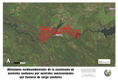 El presente trabajo tiene como objetivo principal estudiar las afecciones medioambientales derivadas de la sustitución de la central nuclear de Almaraz por una instalación convencional de carga similar. Para ello, se emplearán herramientas de análisis geoespacial y meteorológico, como el software QGIS y las rosas de viento, que permitirán representar cartográficamente la dispersión potencial de contaminantes en función de los patrones de viento predominantes.