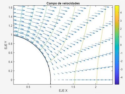 Gracias a la gráfica anterior se observa como los vectores de velocidad definidos por <math> \vec u </math> son siempre perpendiculares a las líneas equipotenciales del fluido. | Gracias a la gráfica anterior se observa como los vectores de velocidad definidos por <math> \vec u </math> son siempre perpendiculares a las líneas equipotenciales del fluido. | ||
