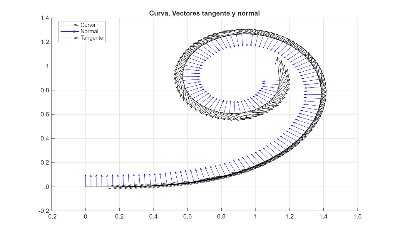 title('Curva, Vectores tangente y normal');