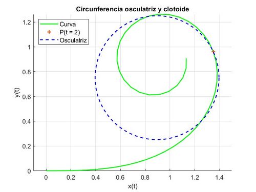 legend('Curva', 'P(t = 2)', 'Osculatriz','Location', 'northwest', 'TextColor', 'black', 'FontSize', 10);