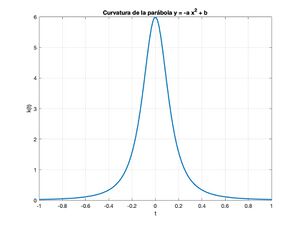 Se puede apreciar como en los extremos la curvatura es mucho menor que en el centro de la parábola, lo que se ajusta a la perfección con la forma característica de las parábolas. Todo esto se observa mejor visualmente en la figura adjuntada. Se puede concluir de esta forma que los extremos x=1 y x=-1 son los puntos de menor curvatura y el punto x=0 es el de máxima curvatura.