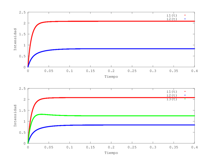 | + | Observando la evolución de las intensidades a un tiempo tan pequeño, comprobamos la gran variación inicial que éstas sufren. Esto es debido al carácter exponencial de la función intensidad. | ||