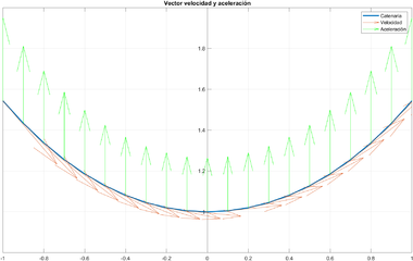 El vector velocidad se halla mediante la derivada con respecto el tiempo de la ecuación de la curva de la catenaria. El vector aceleración es la derivada segunda de la ecuación con respecto al tiempo (derivada de la velocidad con respecto al tiempo). Los vectores velocidad y aceleración se representan gráficamente usando el siguiente código: