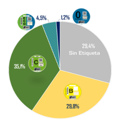 Debido a que no se dispone de un aforamiento de los distintos vehículos con sus respectivas etiquetas medioambientales, se realiza una estimación en base a la distribución nacional de vehículos en base a su etiqueta.