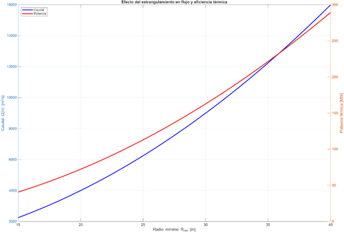 Gráfico del efecto del estrechamiento sobre el caudal y la potencia térmica disipada