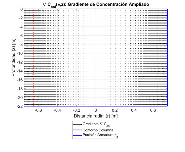 - 6 Representación de el campo del gradiente de la concentración infiltrada dentro de una columna, sobre una sección vertical que pasa por el eje de la columna