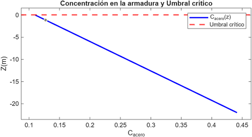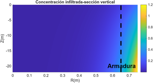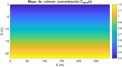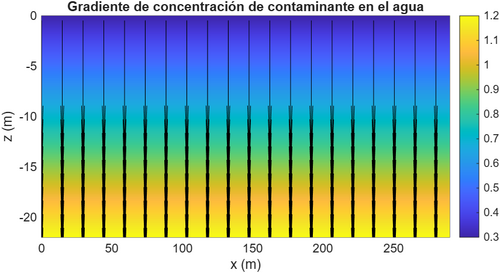 La concentración de contaminantes en el agua depende únicamente de la profundidad y aumenta hacia el fondo por sedimentación, entonces la masa total se obtiene integrando el campo de concentración en el agua a lo largo de la profundidad y multiplicando por el área efectiva del fondo del tanque.