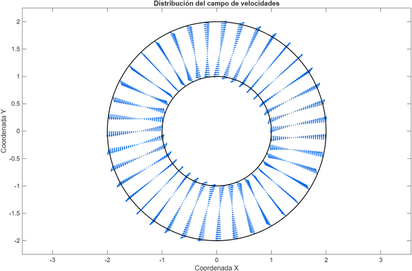 Para ello tendremos en cuenta que los dos cilindros tiene 2 metros de profundidad y la velocidad del fluido esta condicionada por la ecuacion: [math]\vec{u}(\rho,\theta) = \left(\frac{4}{3}\rho - \frac{4}{3}\rho\right)\,\vec e_{\theta} [/math]