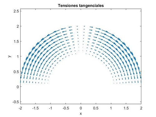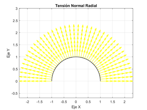 De forma análoga a lo mostrado en el apartado anterior, la componente tangencial es nula en todos los puntos, por lo que no existen direcciones donde esta sea mayor. La representación gráfica es posible, aunque la magnitud sea cero, y la deformación del campo queda determinada exclusivamente por las tensiones normales.