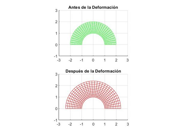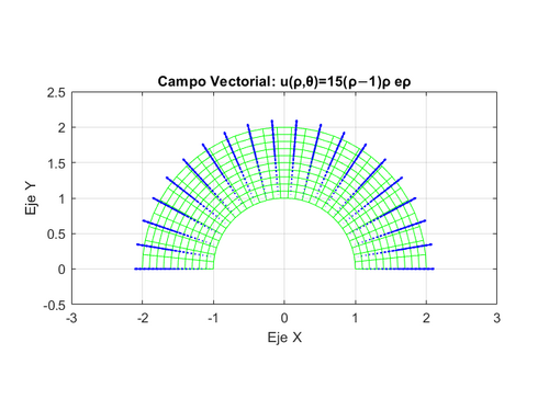 Este campo puede interpretarse como una expansión uniforme hacia el exterior, que separa progresivamente las circunferencias de radio 1 y 2 sin introducir componente angular. A partir de esta deformación se estudiarán distintas magnitudes —gradiente, divergencia, rotacional y tensiones— con el fin de comprender cómo responde el material del arco ante una perturbación radial.