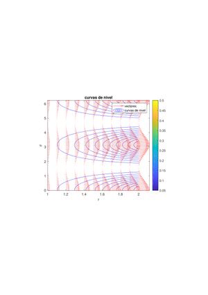 quiver(R,theta,Dx,Dy,'color','r'); % Dibuja un campo de vectores sobre las curvas de nivel