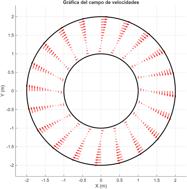 Partiendo de las siguientes expresiones; [math]\vec{u}(\rho,\theta) = f(\rho)\,\vec{e}_\theta,\quad f(\rho) = a\rho + \frac{b}{\rho}[/math]; y los valores anteriormente calculados; [math]b = \frac{2}{3} \omega_e + \frac{4}{3} \omega_i[/math], [math]a = - \frac{2}{3} \omega_e - \frac{1}{3} \omega_i[/math], si suponemos que [math]|\vec{\omega}_e| = |\vec{\omega}_i| = 1 \text{ y } \mu = 1[/math], podemos representar graficamente nuestro campo de velocidades: