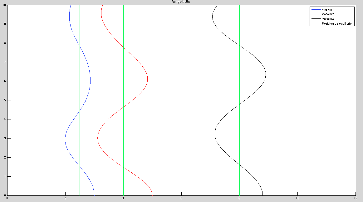 Suponemos que en el instante t=0 las tres masas están desplazadas 0.5, 1 y 0.8 metros hacia la derecha de la posici ́on de equilibrio y se sueltan repentinamente, sin velocidad. Vamos a suponer que k1=4N/m, k2=2N/m, k3=1N/m, k4=3N/m, m1=2kg, m2=1kg, m3=3kg, que la distancia entre las paredes es de 12 metros y que en equilibrio las tres masas están en las posiciones 2.5, 4 y 8.Resolveremos el problema numéricamente utilizando los métodos de Euler modificado y Runge Kutta con pasos de h=0.1m y h=0.025m.