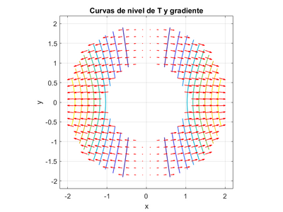 En las siguientes imágenes se representa en primer lugar el campo gradiente; y posteriormente, la comprobación de perpendicularidad del campo gradiente con respecto a las líneas de nivel de la temperatura.