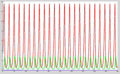 Después, con las presas en el mismo número de individuos y una especie de depredadores reducida a una milésima parte y la otra aumentada mil veces la cantidad anterior llega a apreciarse como la estabilidad del ecosistema es alcanzada de forma mas rápida sin que la especie de menor número interfiera en la dominante.
