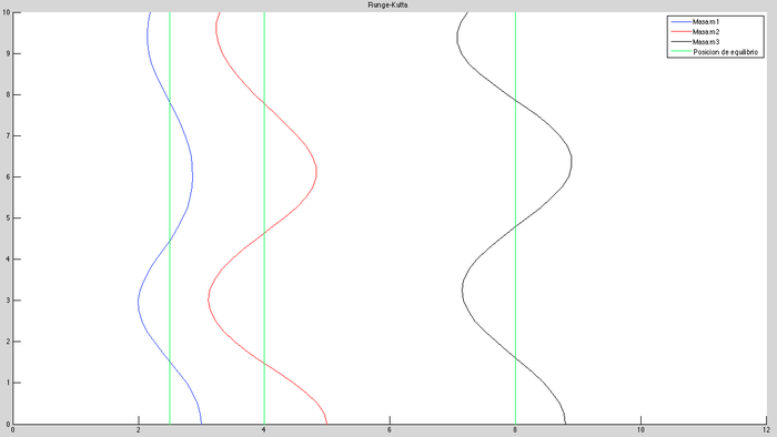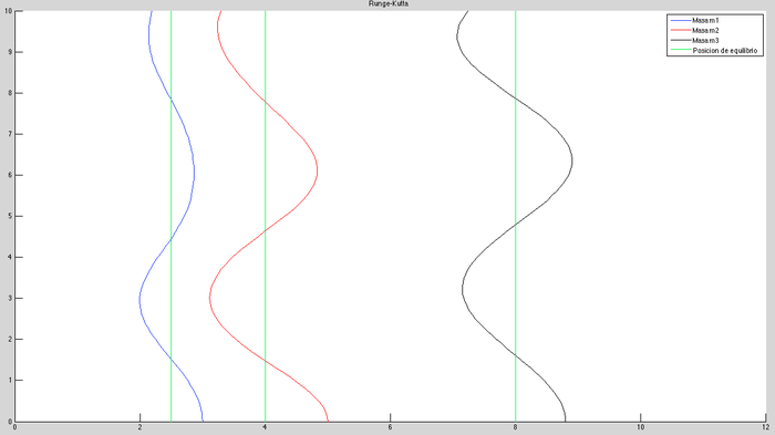 Suponemos que en el instante t=0 las tres masas están desplazadas 0.5, 1 y 0.8 metros hacia la derecha de la posici ́on de equilibrio y se sueltan repentinamente, sin velocidad. Vamos a suponer que k1=4N/m, k2=2N/m, k3=1N/m, k4=3N/m, m1=2kg, m2=1kg, m3=3kg, que la distancia entre las paredes es de 12 metros y que en equilibrio las tres masas están en las posiciones 2.5, 4 y 8.Resolveremos el problema numéricamente utilizando los métodos de Euler modificado y Runge Kutta con pasos de h=0.1m y h=0.025m.