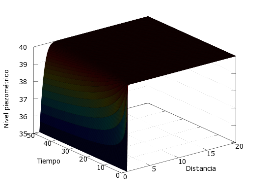 Las condiciones de contorno impuestas (tipo Dirichlet), son una altura de pozo constante [math]h_{p}[/math] y [math]\rho\in (\rho_{0},20)[/math]. Las condiciones serán: : [math]h(\rho _{0},t) = h _{\rho}\quad (1)[/math]: [math] h(20,t) = h _{0}\quad (2)[/math]