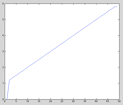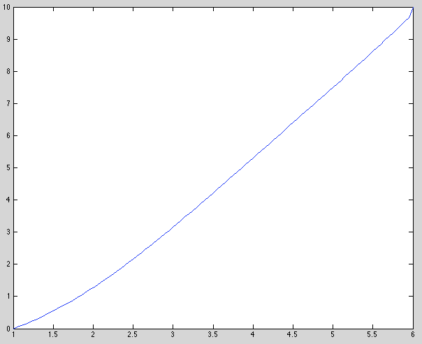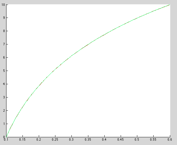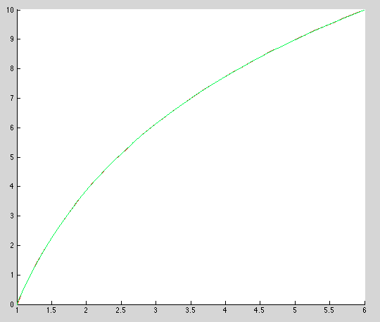 Se puede deducir a partir de las siguientes gráficas que para grandes tiempos, la temperatura apenas varía dada la solución caracterizada por una función logarítmica decreciente. En este caso el término [math] u_t[/math] se puede despreciar y la temperatura toma un valor estacionario en cada punto de la varilla. Esta ecuación verifica el estado estacionario: [math] u_{pp}+\frac{1}{p} u_p=0 [/math] Resolviendo la ecuación analíticamente observamos que satisface la función de tipo logarítmica dada por [math] u=\frac{10}{log(6)} log(p) [/math], tal como se observa si representamos la solución del problema añadiendo las siguientes lineas a cualquiera de los métodos realizados anteriormente.