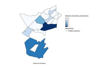 • Centros de Comercio (CC). Consideramos los grandes centros comerciales. No se consideran mercados de barrios por las mismas razones que en las anteriores capas: su ámbito de influencia es menor y, por tanto, la gente va ellos mayoritariamente a pie. Se ha formado uniendo las capas 12 y 13.