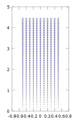Ahora consideramos un campo vectorial definido como [math] u(x,y)=\displaystyle\frac{j}{10}(j·r_o)^2[/math],y desarrollando [math]r_o = xi + yj + zk[/math] al multiplicar escalarmente por j te queda simplificado el campo a:[math] u(x,y)=\displaystyle\frac{j}{10}(j·yj)^2[/math] equivalente a usar: [math] u(x,y)=\displaystyle\frac{y^2}{10}j[/math] que aplicado sobre el mallado producirá un desplazamiento de los puntos de éste. El campo vectorial, programado en MATLAB y dibujado, será: