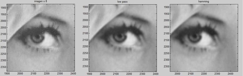 En la siguiente imagen hemos ampliado una zona para poder apreciar mejor cuales son los resultados del filtro, y vemos que aplicándole el filtro Low-Pass la imagen se ve mejor y al añadirle la ventana de Hamming que lo que hace es suavizar la imagen.