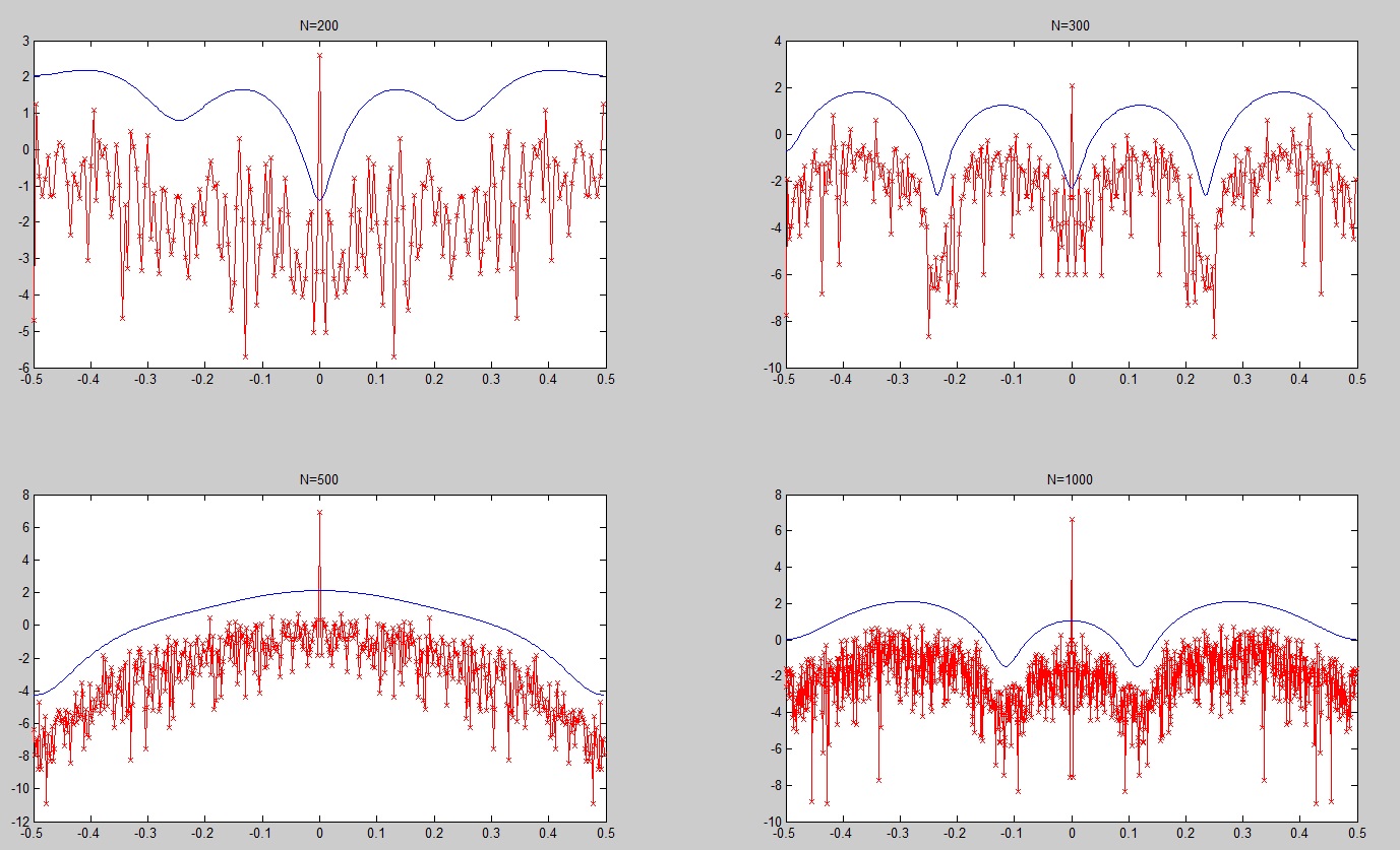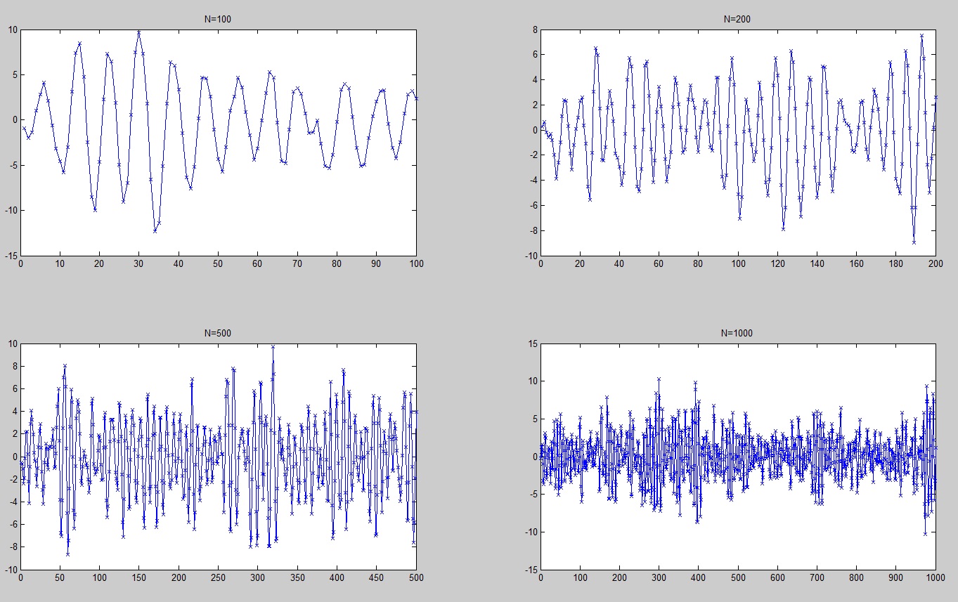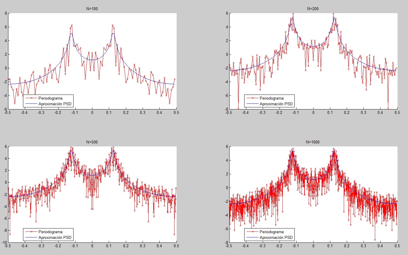 Construiremos un proceso x(t) con parámetros ρ=0.95, θ=π/4 y N=100, 200, 500 y 1000. También dibujaremos el periodograma y la aproximación de la PSD de estos procesos.
