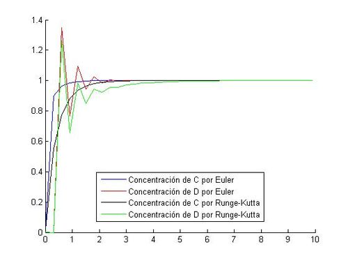 legend('Concentración de C por Euler','Concentración de D por Euler','Concentración de C por Runge-Kutta','Concentración de D por Runge-Kutta','Location','best')