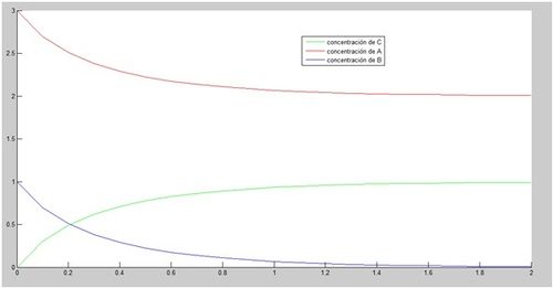 Una vez llegados a este punto, se procede a ver una interpretación gráfica de la reacción. Para ello, se refleja en la gráfica (en un intervalo de 2 segundos), cómo varían las concentraciones tanto de A (a_0=3 mol/L) y B (b_0=1 mol/L) como de C, para una k_1=1 mol/s. Se comienza, por el momento, aplicando el método de Euler. Posteriormente se utilizarán métodos más precisos.